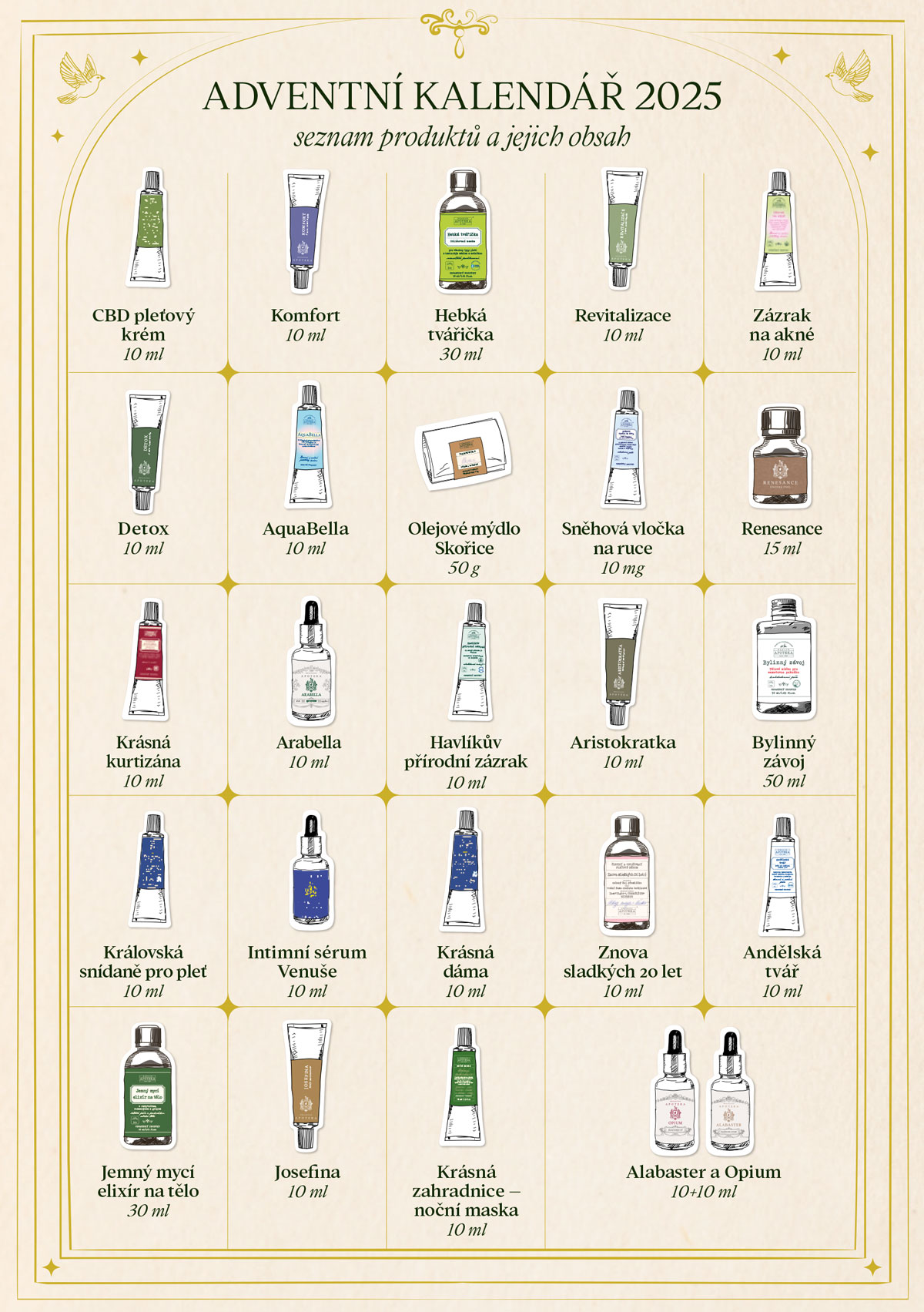 Každé otevření dvířek vás přiblíží o krok blíž Vánocům, ale také k sobě. Tento kalendář není jen o kosmetice, je o rituálech, o čase pro sebe, o návratu k jednoduché radosti z malých věcí. Zasloužíte si prožít advent s vůní bylin, dotekem péče a chvílí, která bude jen vaše.